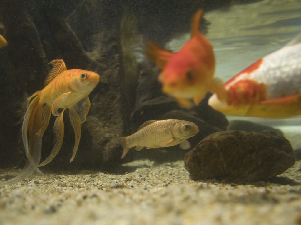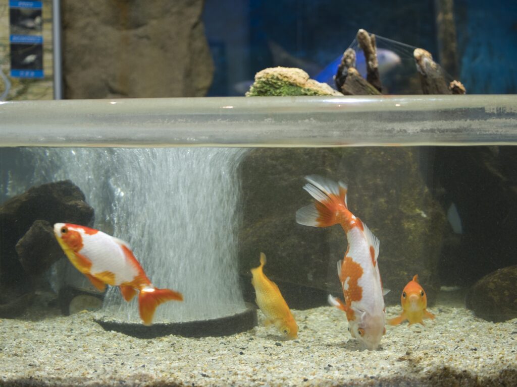 施設奥に進むと、浅くて直径の大きい円柱水槽が現れます。この水槽では、ギンブナのほか、ヒブナや和金体型の金魚が泳いでおり、非常に華やかな印象を受けます。