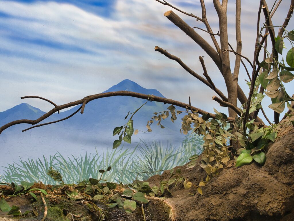 さらに目を引くのが、幅のある壁面一体型のジオラマ水槽です。