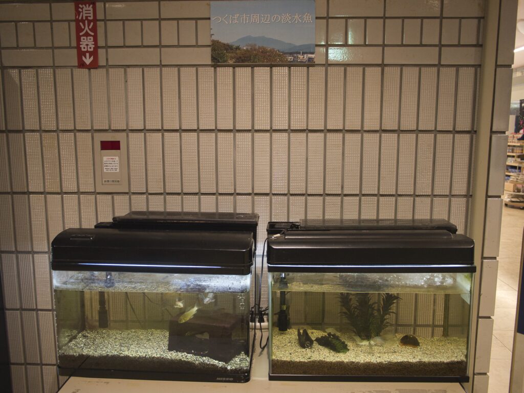 1基はチョウザメが泳ぐ円柱水槽、残り2基が「つくば市周辺の魚」として紹介されている小型水槽です。この2基の水槽内に、それぞれフナの姿を確認できました。