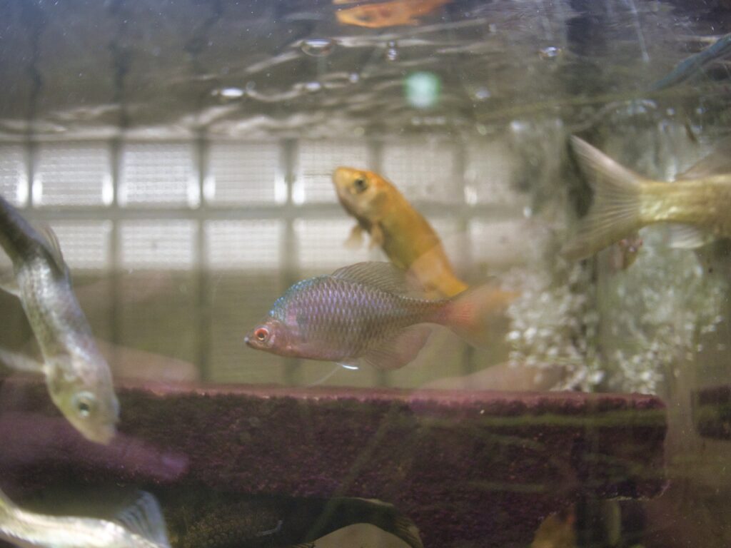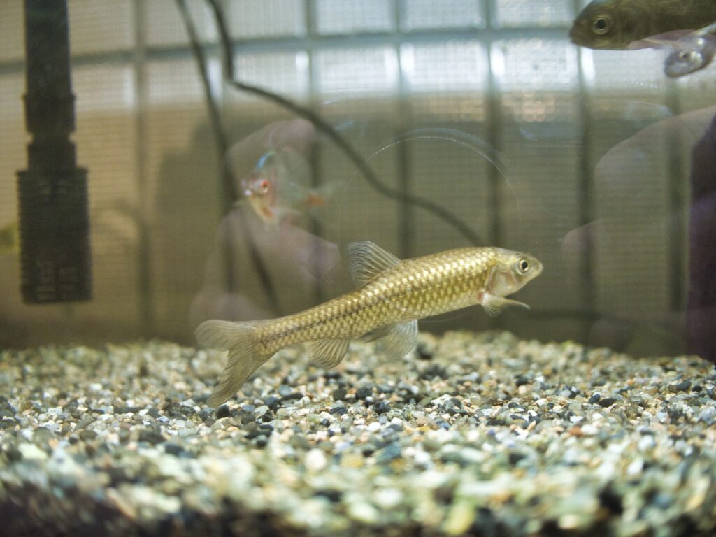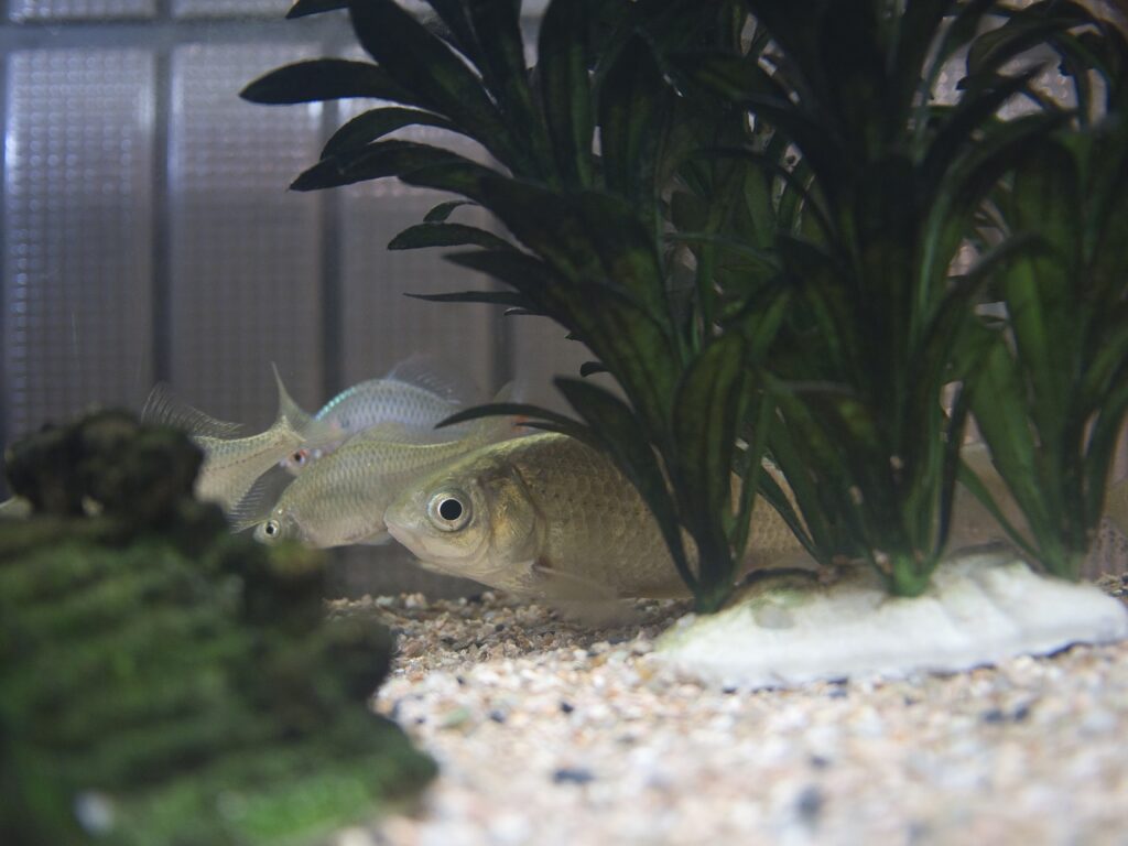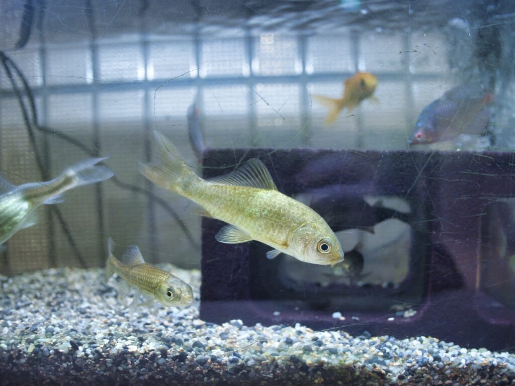 水槽内ではフナが最も大きな存在であり、他魚種と比べても目に留まりやすい展示になっています。