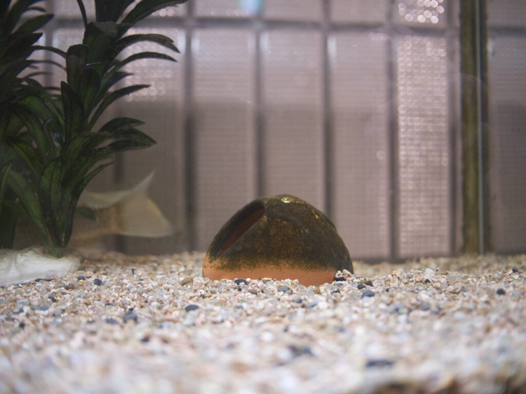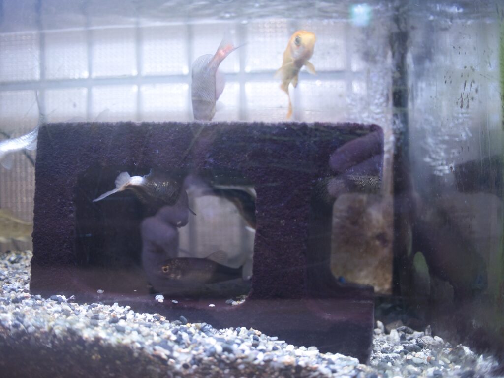 水質は比較的クリアで管理自体は悪くありませんが、レイアウトは人工水草や陶器ブロック、植木鉢といった人工物が中心で、自然の水辺らしさはあまり感じられません。