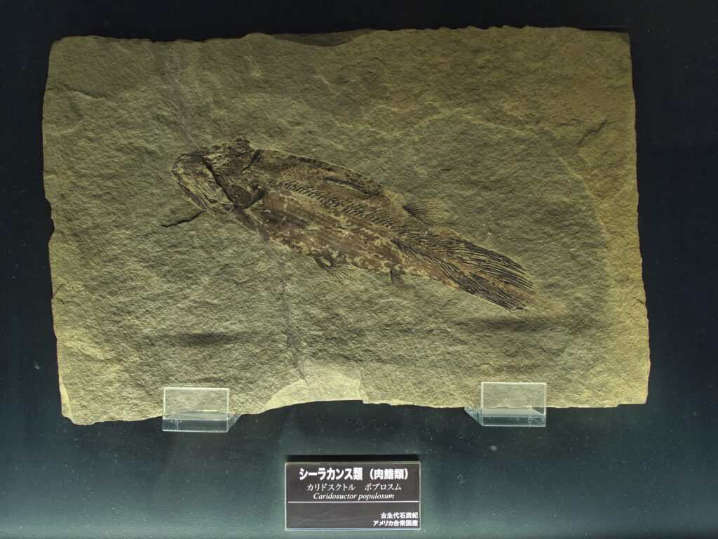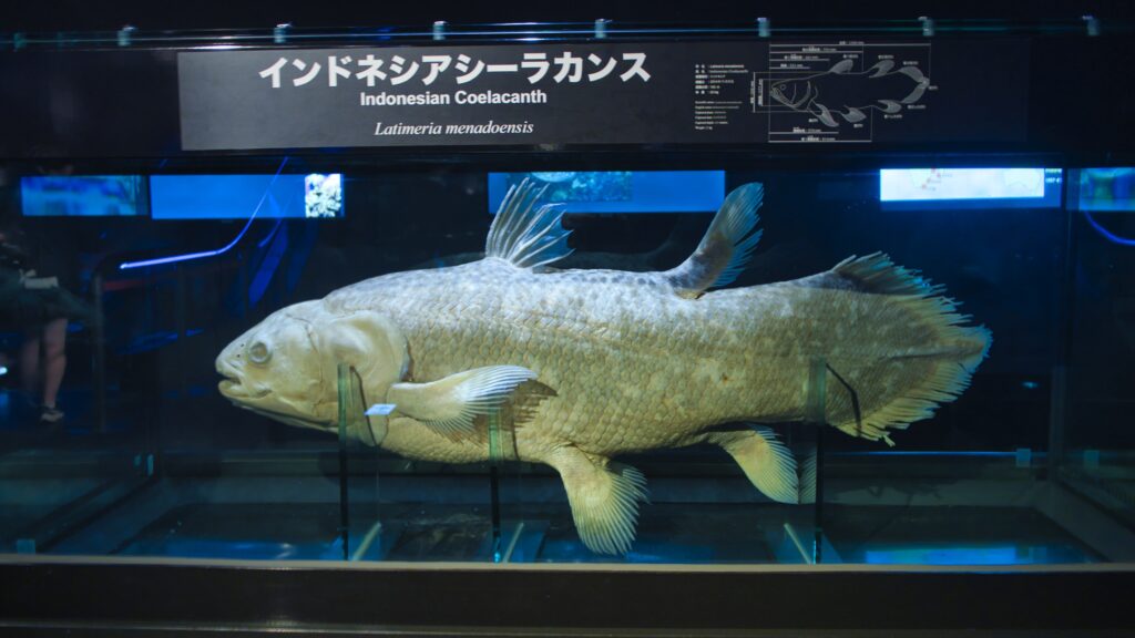 シーラカンスに関する展示では、標本や模型、映像を通して、その進化史や特異な生態が紹介されています。