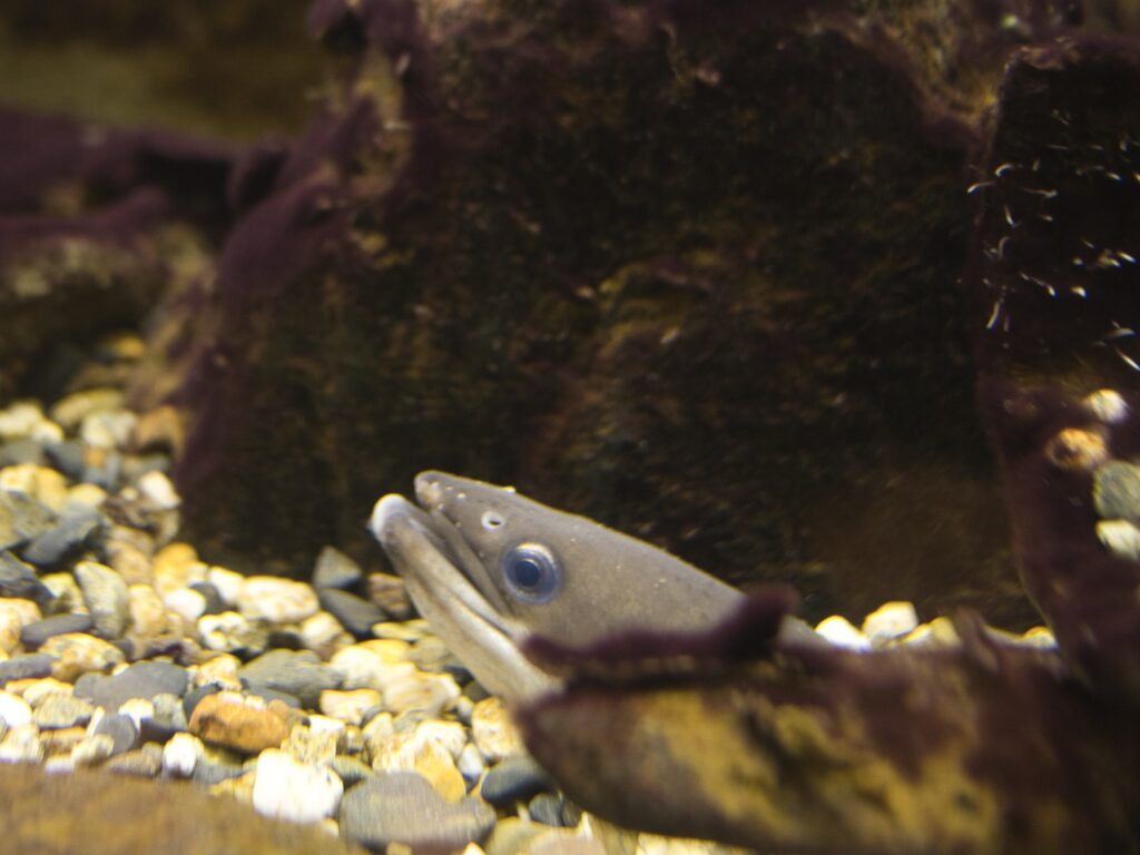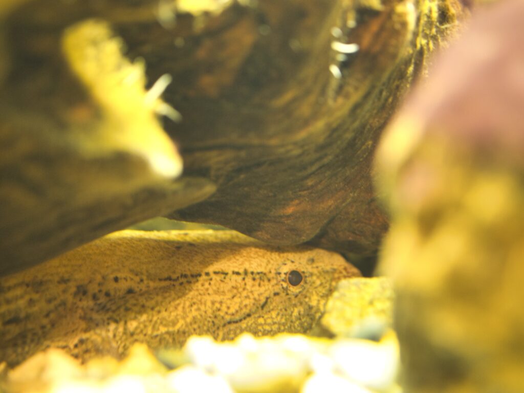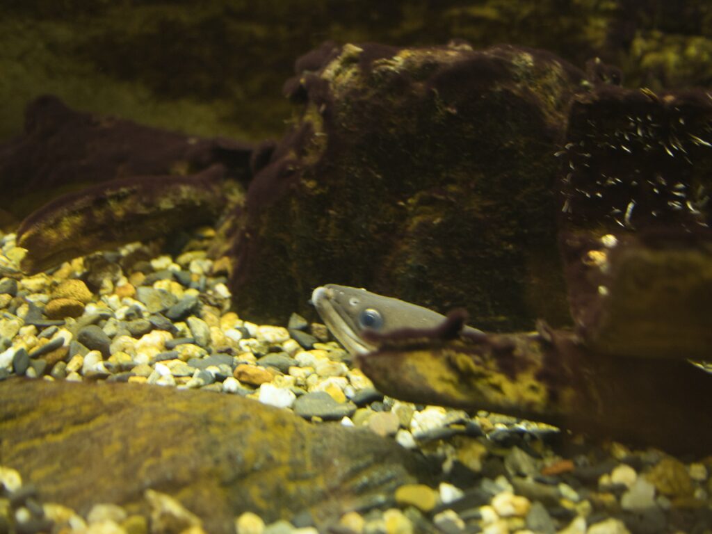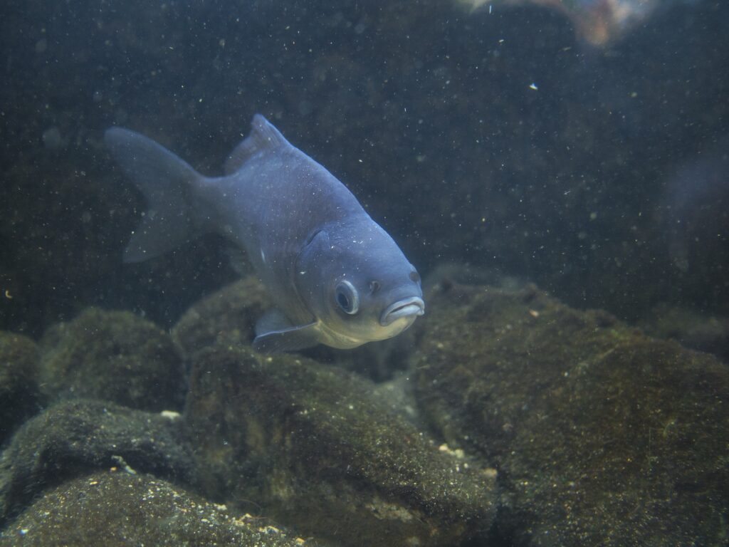 ウナギ展示エリア「うなぎ弁天」では、ギンブナを1個体確認しました。流木の近くに定位し、ウナギやカワアナゴと同じ水槽で泳いでいます。演出上は水槽の賑やかし役のようにも見えますが、サイズは明らかに大きく、単なるエサ魚とは異なる存在感がありました。