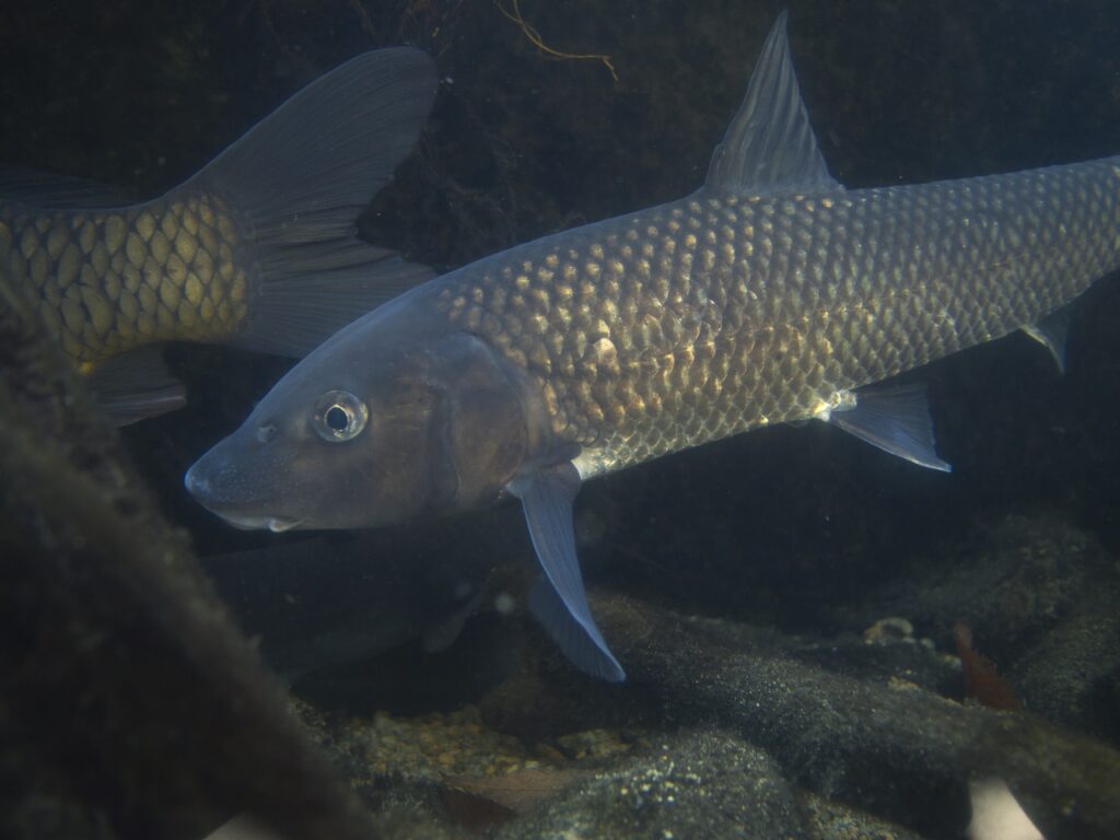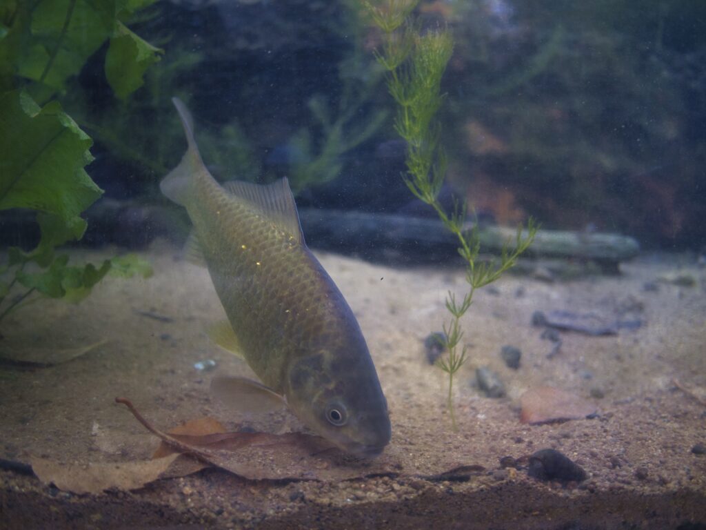 用水路を再現した水槽では、ゲンゴロウブナを2個体確認しました。コイ、ニゴイ、ナマズと同居しており、底質は砂泥、流れは緩やかです。