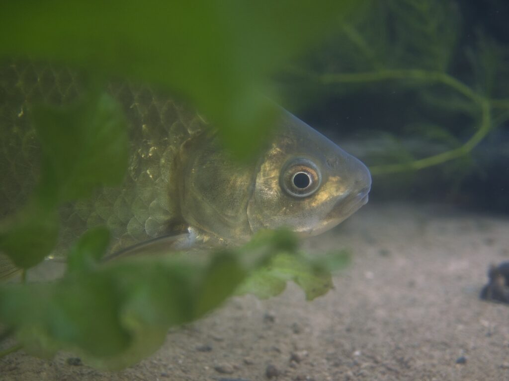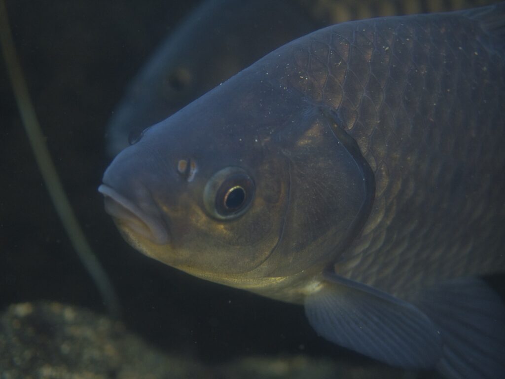 フナは底層で採餌行動を見せており、群れとして目立つ存在ではなく、環境の一部として自然に溶け込んでいました。