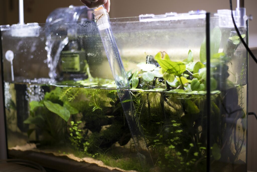 水換え時には、プロホースなどを使って砂利の中に軽く差し込み、汚れを吸い出します。すべてを完璧に掃除する必要はありませんが、数回に分けて全体をローテーションするのが理想です。