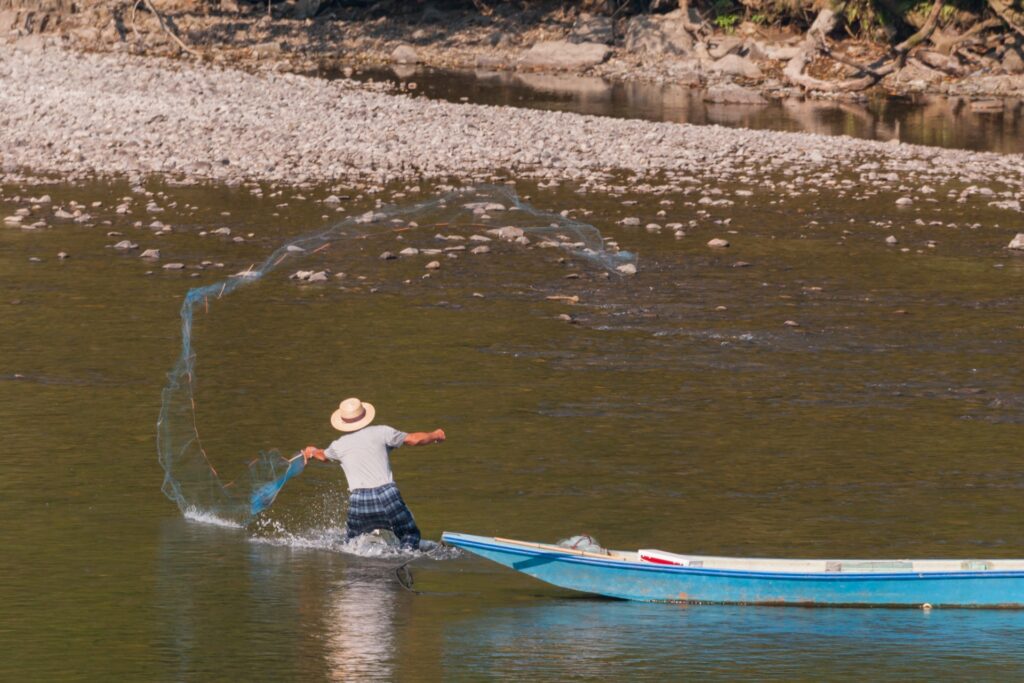 投網は、円形の網を投げて魚を包み込むように捕獲する漁法です。
