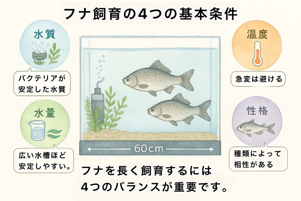 フナを長生きさせるためには、「水質」「水量」「温度」「性格」の4つの要素がポイントです。